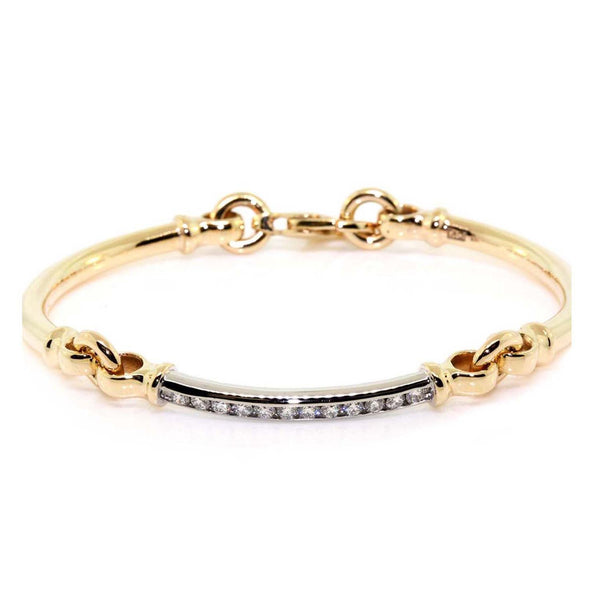Hand-assembled 14k Yellow and White Gold Three Section Diamond Bangle. The white gold centre bar is set with 1.3cts of round brilliant cut diamonds, quality FG colour and VS-SI1 clarity. The bangle is finished with a 14k yellow gold lobster clasp and weighs 30 grams in the stock wrist size. The bangle is made to order in the required wrist size.
