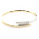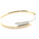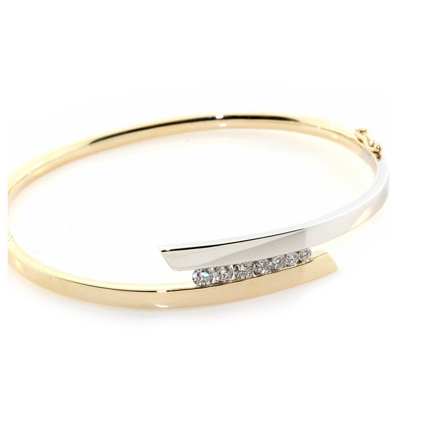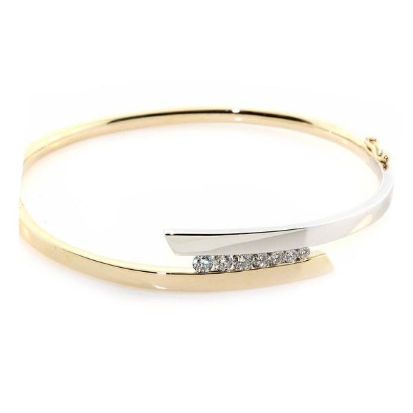 9k yellow and white gold hinged diamond bangle, set with 0.53cts of round brilliant cut diamonds, quality GH colour and SI clarity. The bangle weighs 16.5 grams.