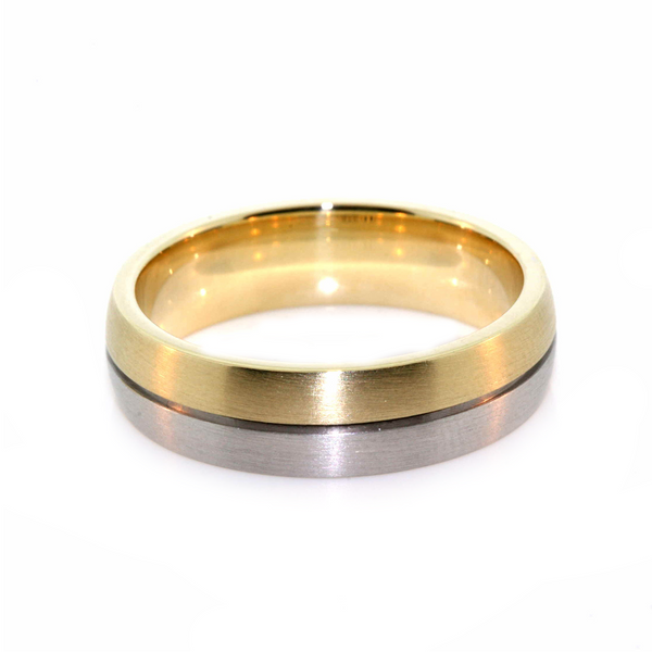 Gent's 9k yellow and white gold wedding ring. The ring is 6mm wide and is from the Dora Collection. The ring is ordered in the required finger size.
