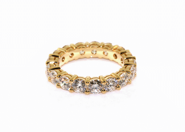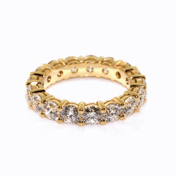From our Workshop, an 18k yellow gold full circle diamond wedding or eternity ring. The ring is set with 3.5cts of round brilliant cut diamonds set into shared claw settings all the way around the ring. This ring is made to order in the required finger size.