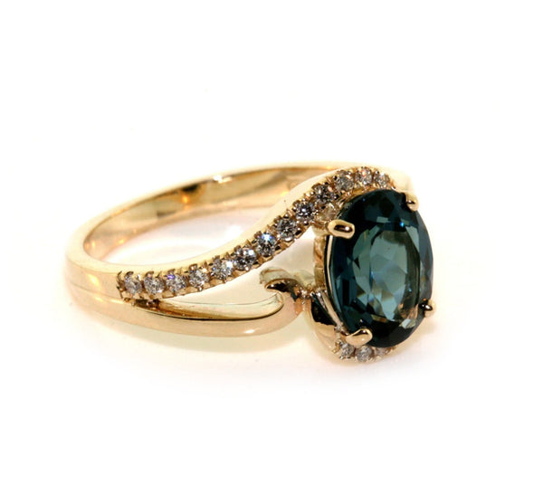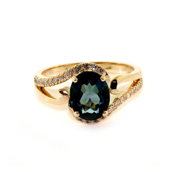 9k yellow gold dress ring set with a 2ct oval London blue topaz measuring 9x7mm, and 0.22cts of round brilliant cut diamonds, FG colour, VS-SI1 clarity.