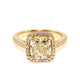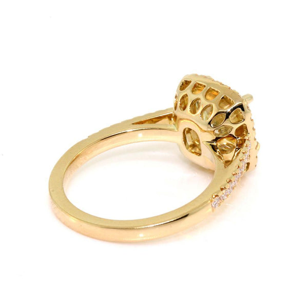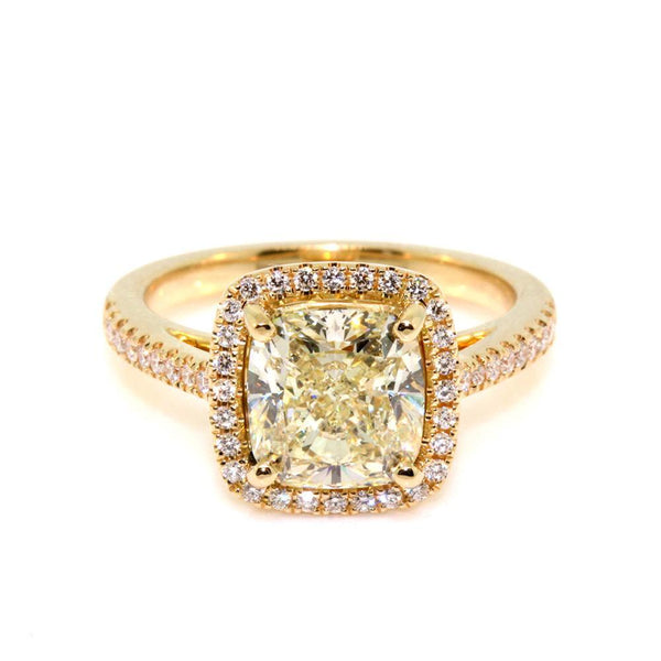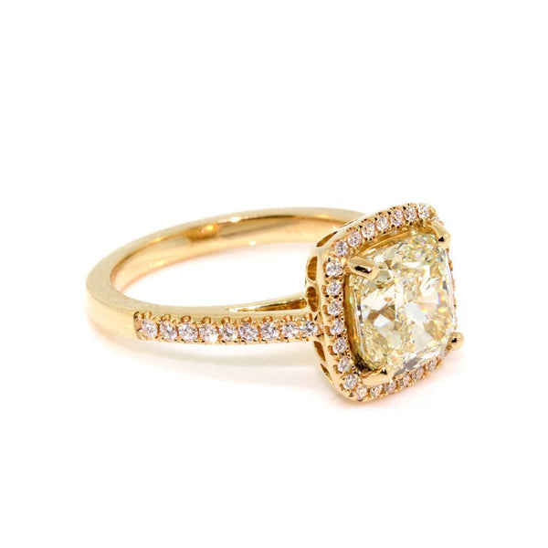 Custom-Made 18k Yellow Gold Diamond Halo Ring. The ring is set with a 3ct cushion cut centre diamond, U-V (yellow) in colour, and SI1 in clarity. The ring is made to order in the required finger size.