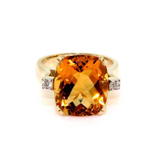 9k Yellow Gold Citrine and Diamond Ring. The ring is set with a 7.8ct cushion shaped citrine, intense orangey yellow in colour and 0.06cts of round brilliant cut diamonds, FG colour, and VS-SI1 clarity.