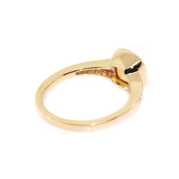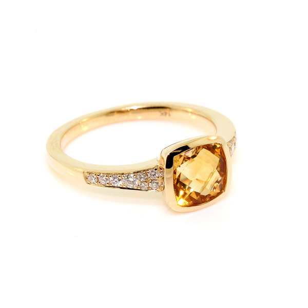 14k Yellow Gold Citrine and Diamond Dress Ring. The ring is set with a 1.48ct cushion shaped chequerboard cut citrine and 0.16cts of round brilliant cut diamonds, G-H colour, SI clarity.
