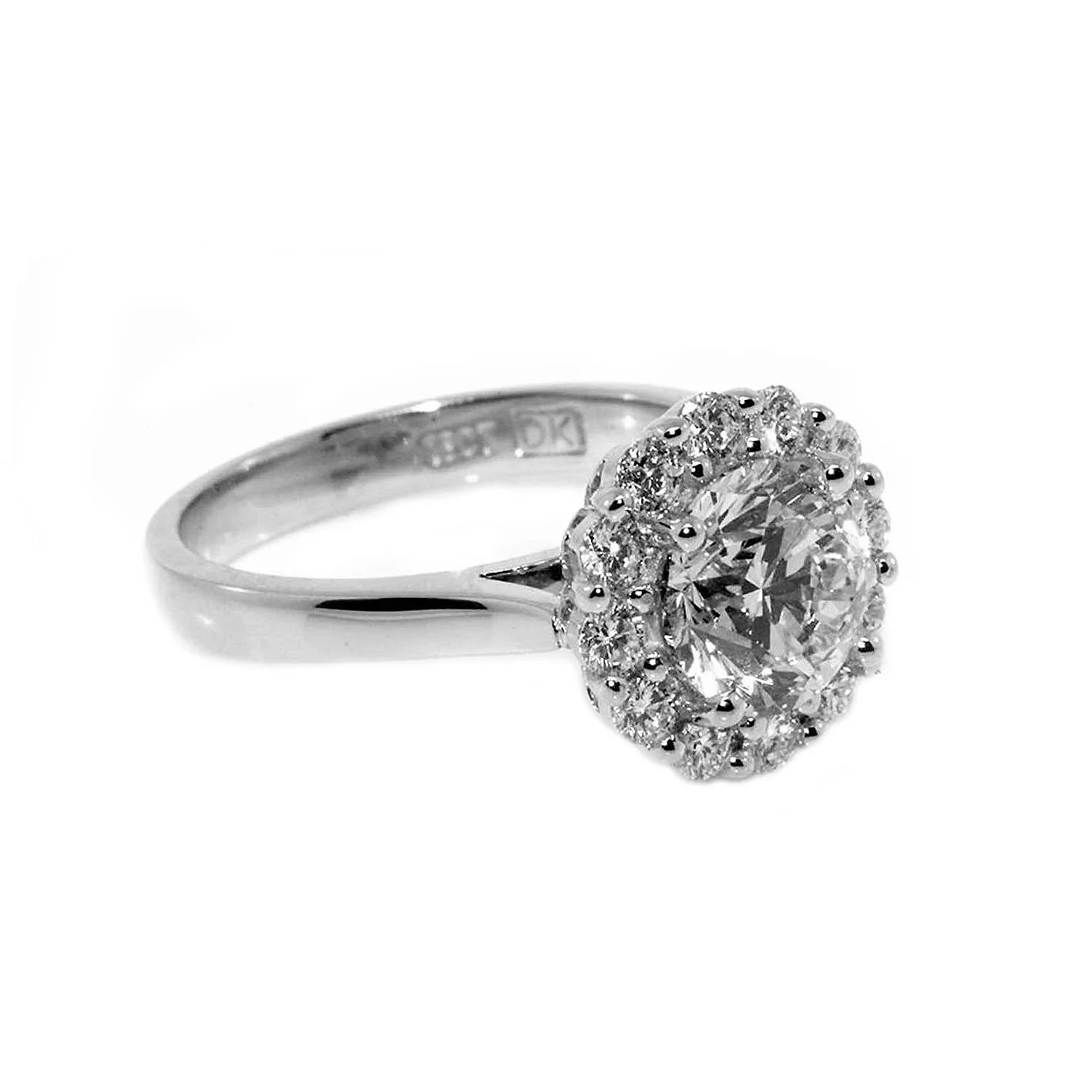Platinum halo ring set with a 2ct round brilliant cut centre diamond, H colour, and I1 clarity and 0.50cts of round brilliant cut diamonds set into the halo. This design is made to order in the required finger size.
