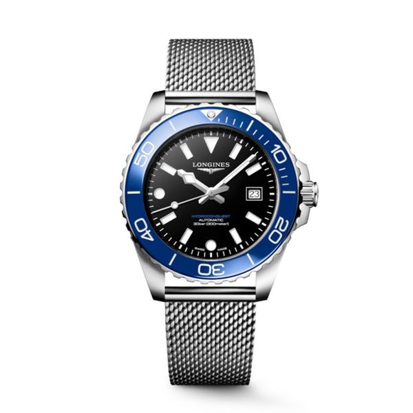 The brand new 2026 Gent's Longines HydroConquest Automatic Watch. The 42mm case and bracelet are stainless steel. The dial is black and the ceramic bezel is blue. The glass is sapphire crystal. The watch features a date function and is 300m water resistant. The movement is automatic.