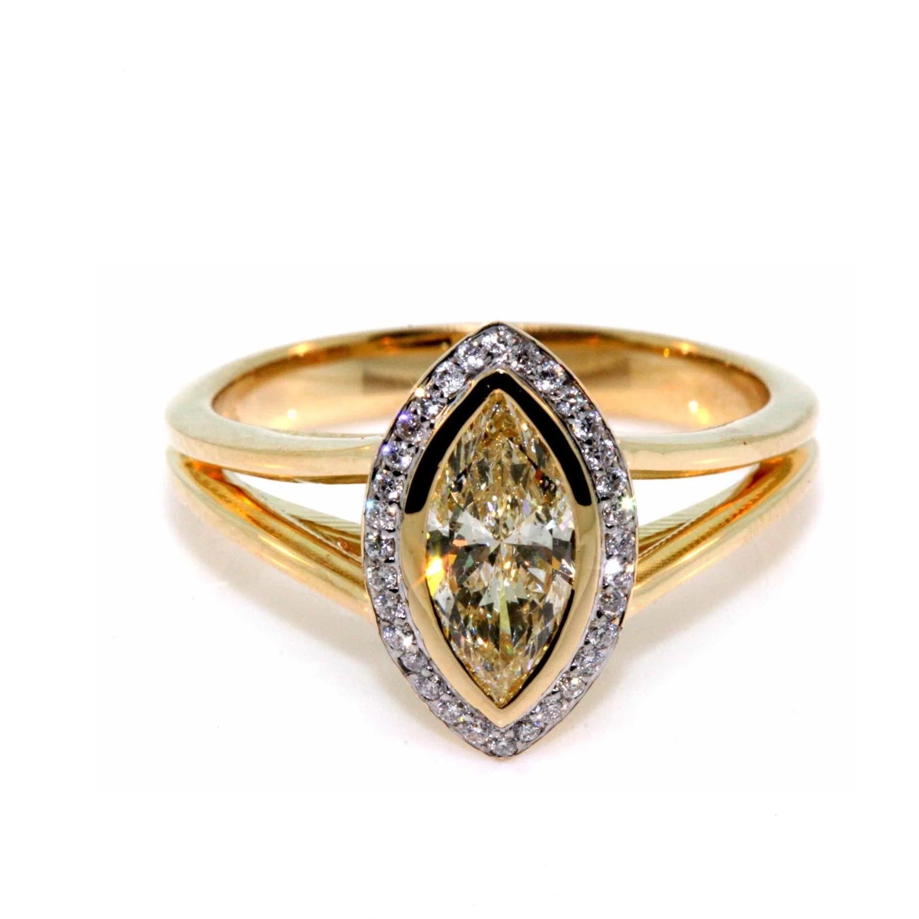 18k yellow gold natural yellow diamond halo ring.  This design can be made with a 0.7ct to 1.2ct natural fancy light yellow marquise cut centre diamond, and 0.15cts of round brilliant cut halo diamonds, FG/VS-SI. The ring is made to order with your preferred centre diamond and is pictured with a 0.70ct marquise cut centre diamond.