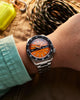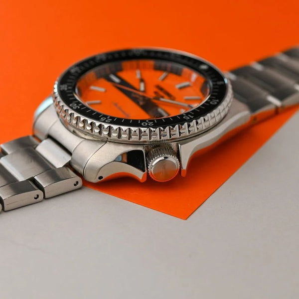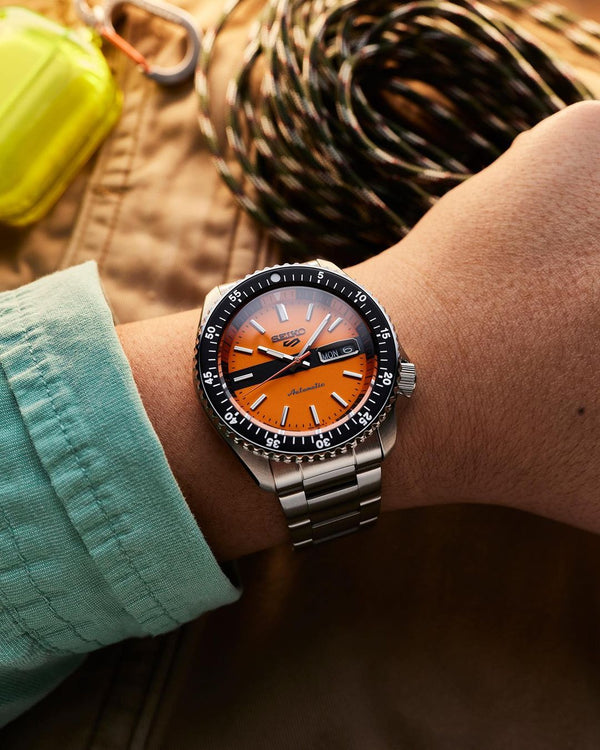 Gent's Seiko 5 Sports Stainless Steel 42.5mm Case and Bracelet Orange and Black Dial Black Bezel See-Through Case Back Day Date 100m Water Resistant Automatic Watch.
