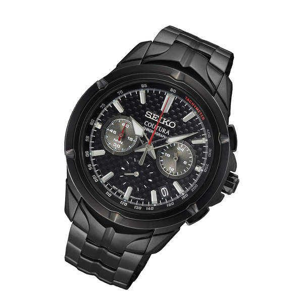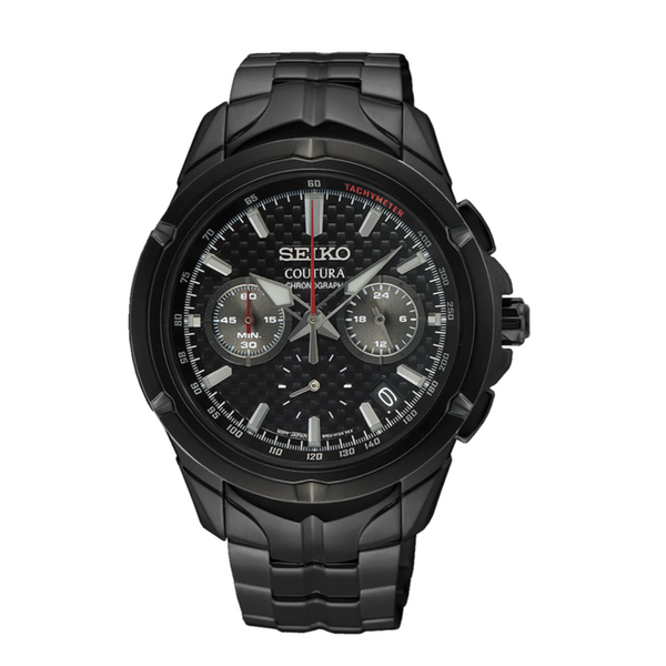 Gents Seiko Coutura Chronograph Black PVD on Stainless Steel 42mm Case and Bracelet Black Patterned Dial with Silver Coloured Accents Three Sub-Dials Tachymetre Inner Ring Sapphire Crystal Glass Date 100m Water Resistant Quartz Watch.