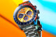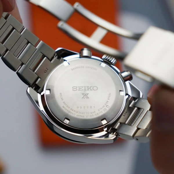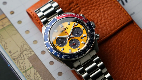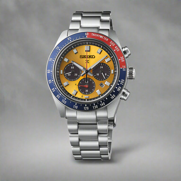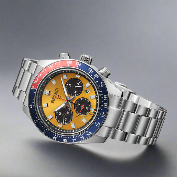 Gent's Seiko Prospex Speedtimer "The Pogue" Chronograph Solar Watch. The 41.4mm case and bracelet are stainless steel. The bezel is blue and red with a tachymetre scale. The dial is orange with three black sub-dials. The watch has a chronograph function, 24-hour hand indicator sub-dial, power reserve indicator, a seconds hand sub-dial and date function. The glass is a curved sapphire crystal. The watch is 100 metres water resistant. The movement is solar powered. Currently out of stock.