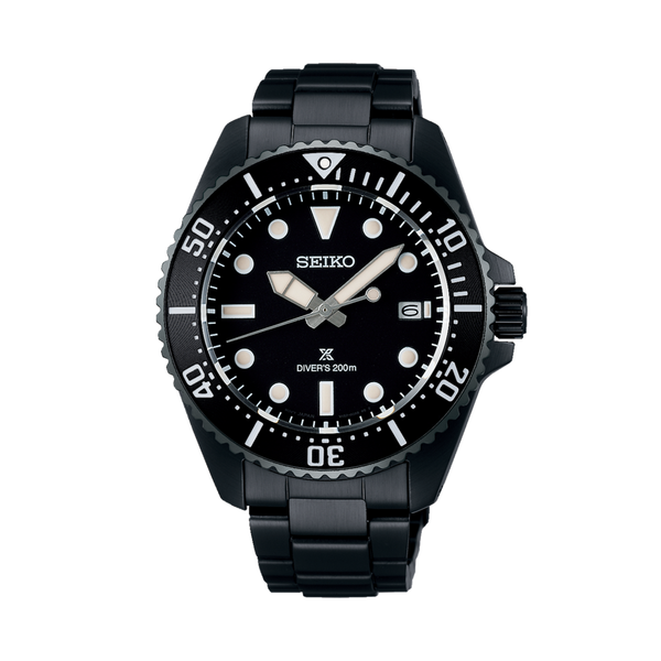 Gents Seiko Prospex Sea Solar Diver’s 200m Watch. The 41mm case and bracelet are black hard coated stainless steel and the bezel is black. The dial is black with a date function. The glass is sapphire crystal and the watch is 200m water resistant. The movement is solar powered.