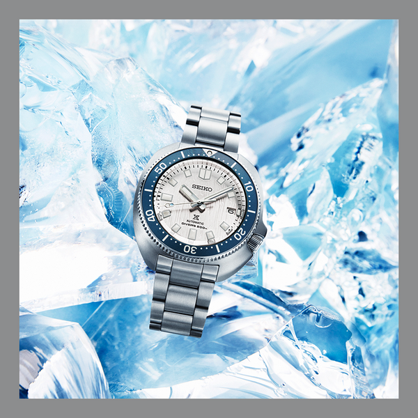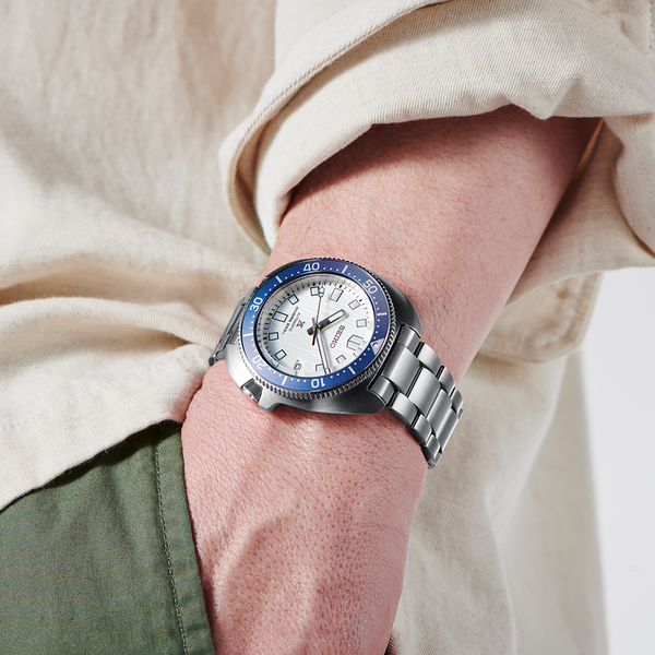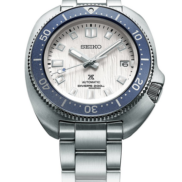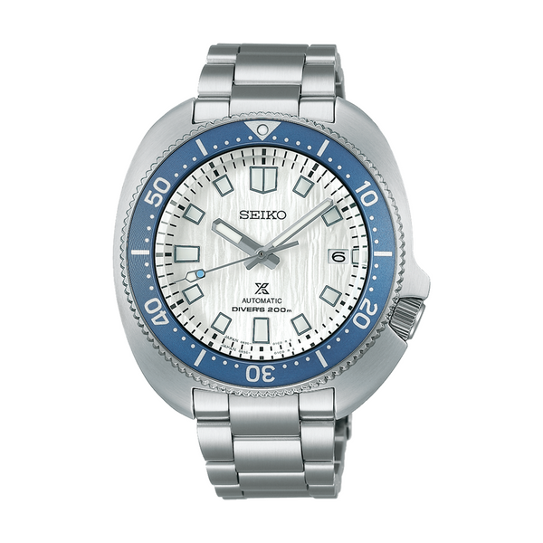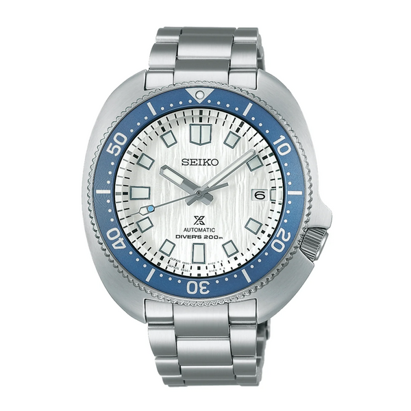 Gent's Seiko Automatic Prospex Diver 200m Watch. The 42.7mm case and bracelet are stainless steel. The dial is white and has a texture applied and the bezel is blue. The glass is sapphire crystal and the movement is automatic.