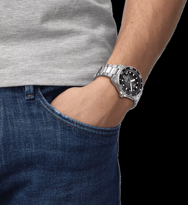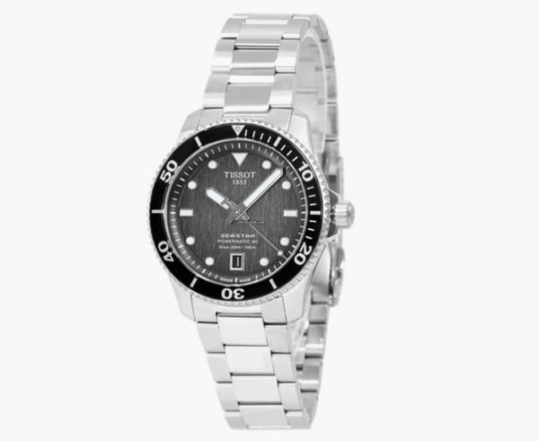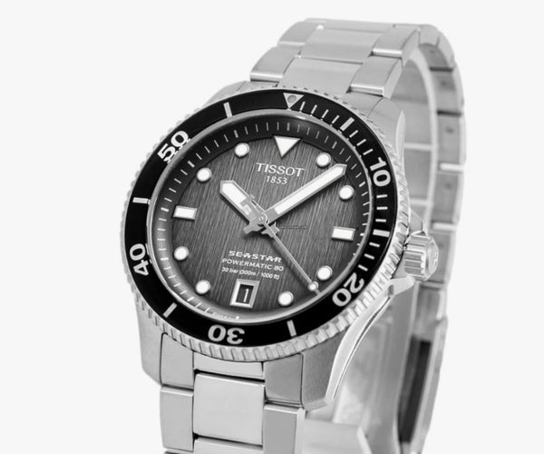 Gent's Tissot T-Sport Seastar 1000 Powermatic 80 Watch. The 40mm case and bracelet are stainless steel with a black mineral bezel ring. The dial is graded grey to black and has a date function. The glass is sapphire crystal. The watch has a see-through case back and is 300 metres water resistant. The movement is an automatic Powermatic 80. Currently out of stock.
